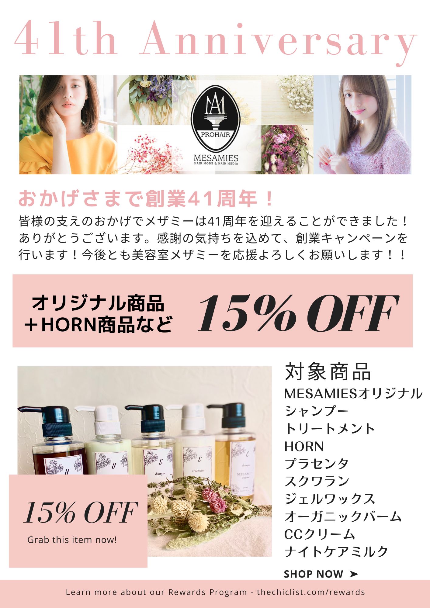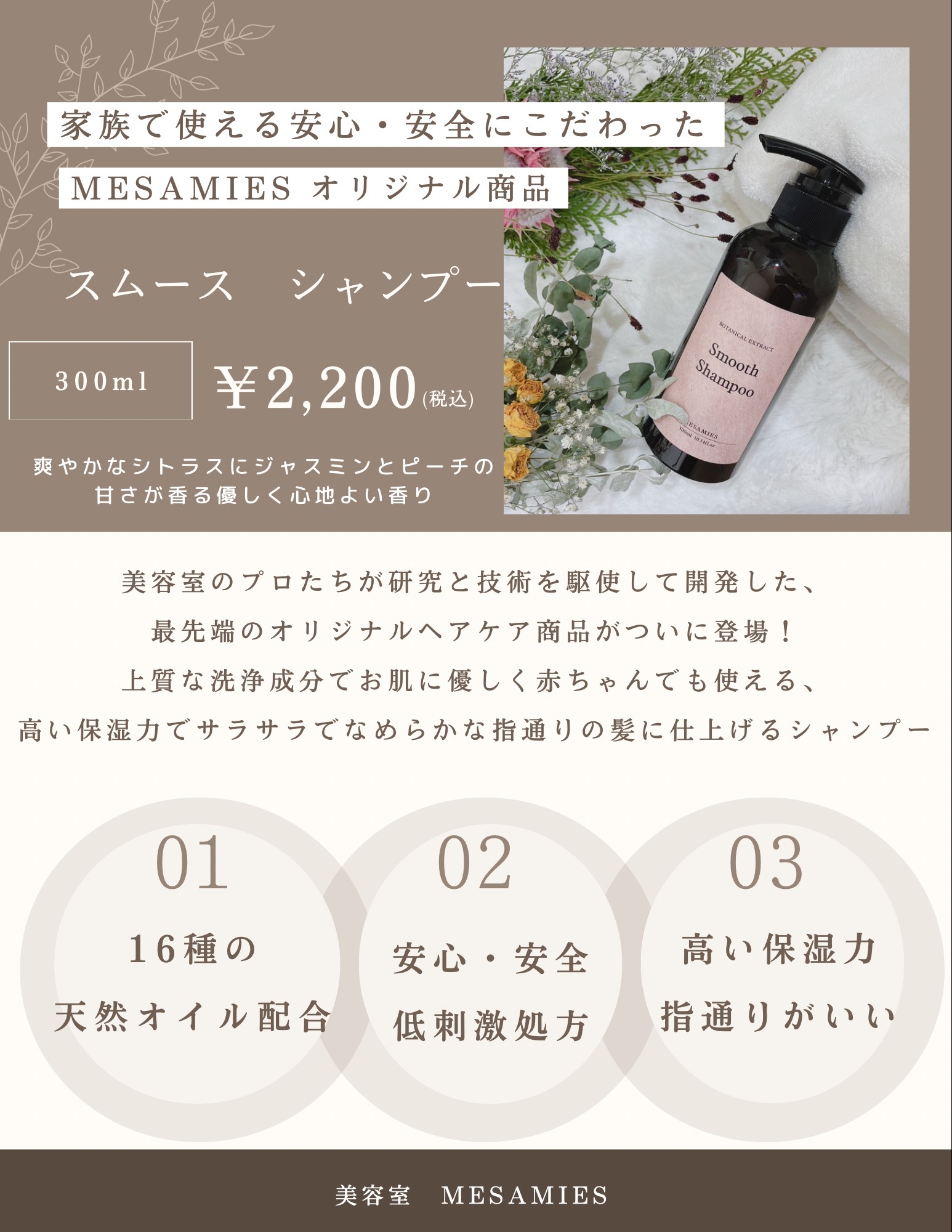 松本市にある美容室MESAMIESオリジナルのシャンプー、トリートメントなどヘアケアに欠かせないアイテムを販売しております。